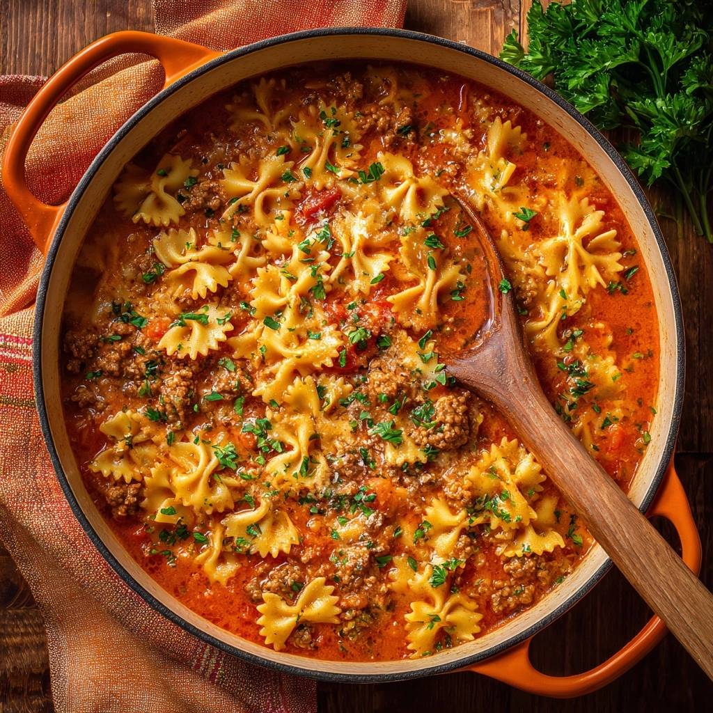 The real secret? Layer the uncooked farfalle evenly and resist stirring for exactly 12 minutes. That prevents starch from releasing too early, keeping every piece firm while the sauce clings perfectly. Trust me, once you try this One-Pot Beef Farfalle, you’ll never go back to separate boiling.
