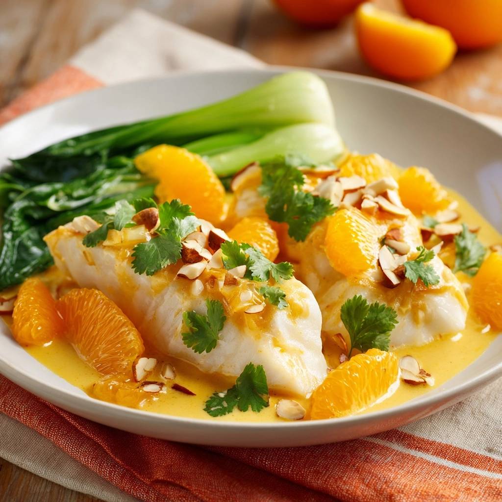 Nestle cod in a single layer, spoon sauce over, then cover. Poach low 8-10 minutes till it flakes easily. Finally, scatter segments, almonds, and cilantro for fresh contrast.