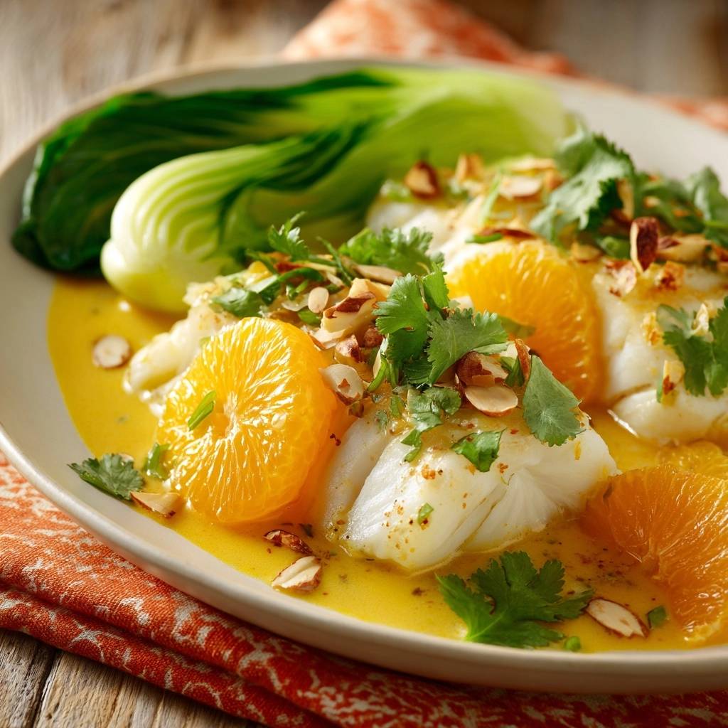 Poaching keeps the fish at a low simmer, locking in juices while infusing zesty orange flavor. In addition, the golden turmeric sauce clings perfectly, and crisp bok choy plus toasted almonds add crunch that makes it irresistible. It’s light yet satisfying, packed with omega-3s from the cod and vitamin C from the oranges.