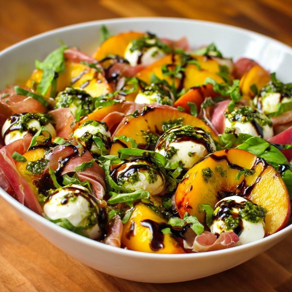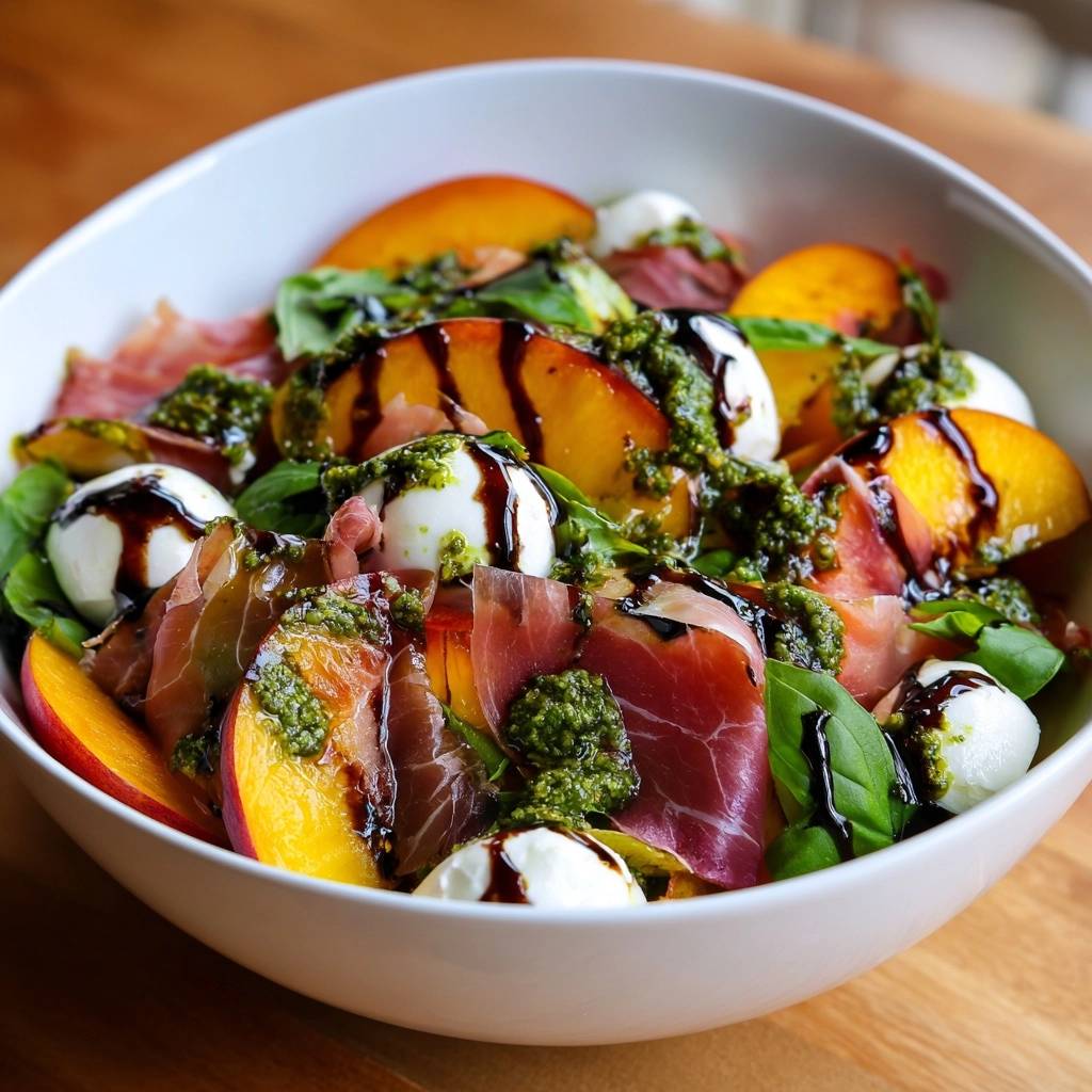 Firm peaches, prosciutto, burrata, arugula, basil, pesto, and balsamic glaze make this Peach Prosciutto Burrata Salad sing. Each fights sogginess while boosting sweet-savory bliss. For instance, high-quality prosciutto delivers thin, melt-in-your-mouth slices if you source it fresh.