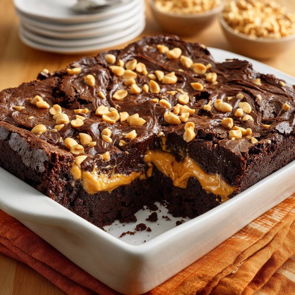 For 9×13, double ingredients but keep temp 350F and add 5-8 minutes. Depth thins, so watch for edge set. Yields thinner but still fudgy peanut butter stuffed brownies.