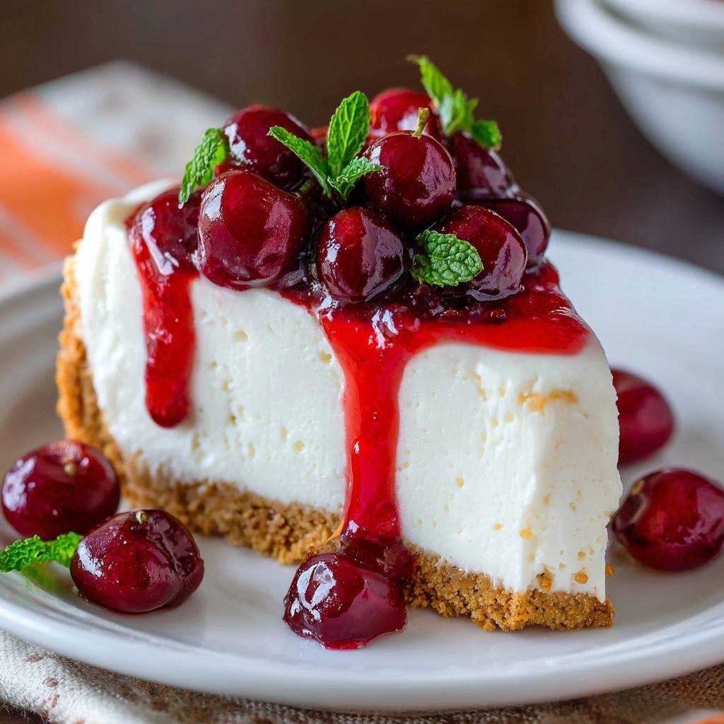 - Run a knife around pan edge, release sides, slice, and spoon cherry topping over each piece. Garnish with mint. Enjoy crack-free bliss!