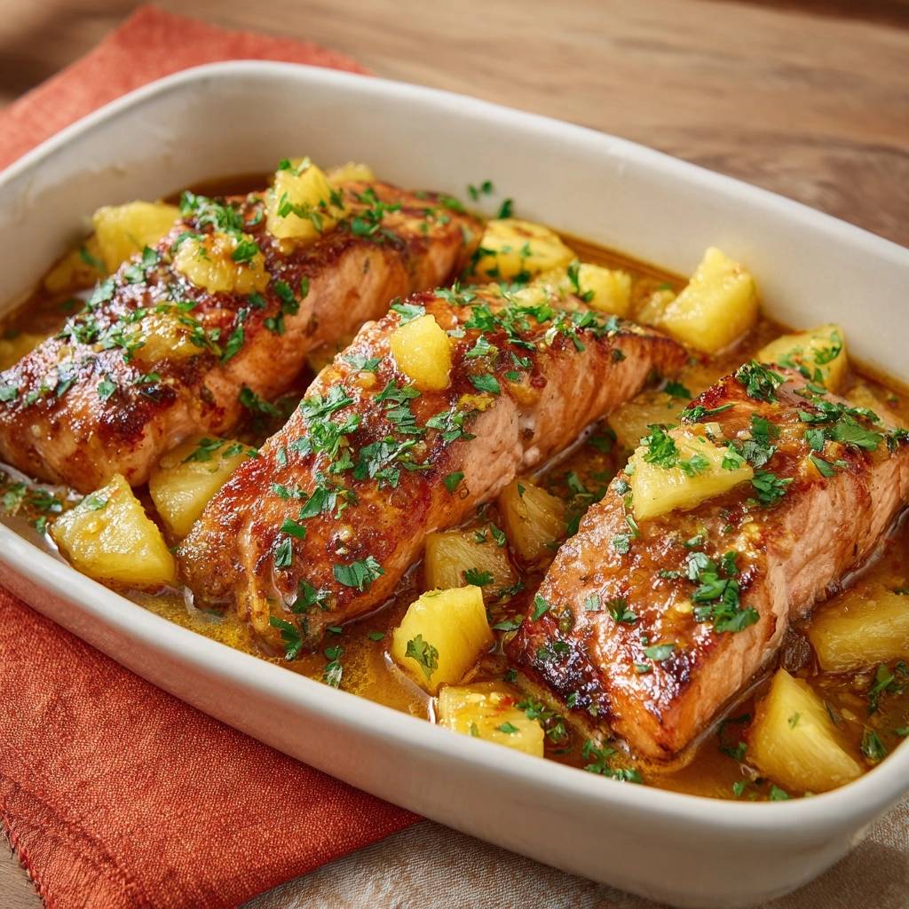 Place salmon in the dish, surround and top with pineapple chunks. Pour glaze over all. Bake uncovered 12 minutes until edges firm and aromatic.
