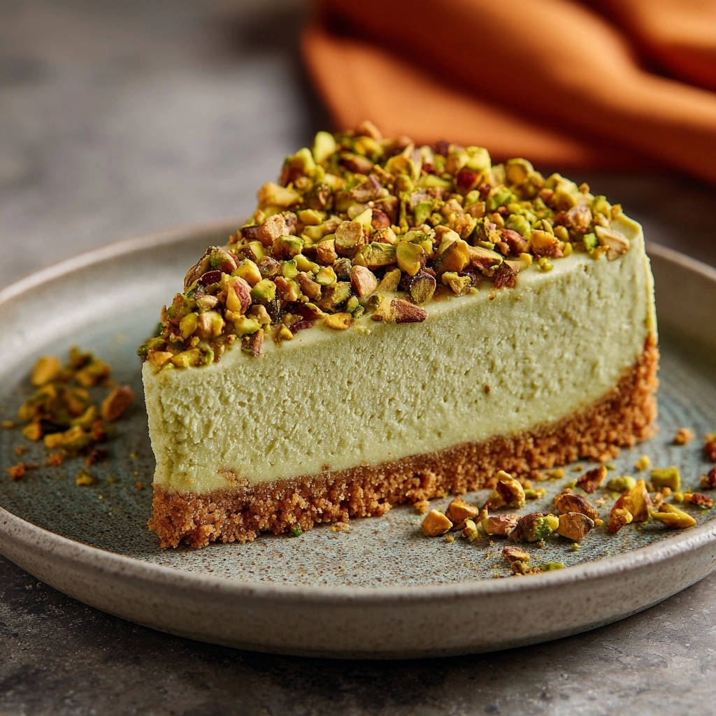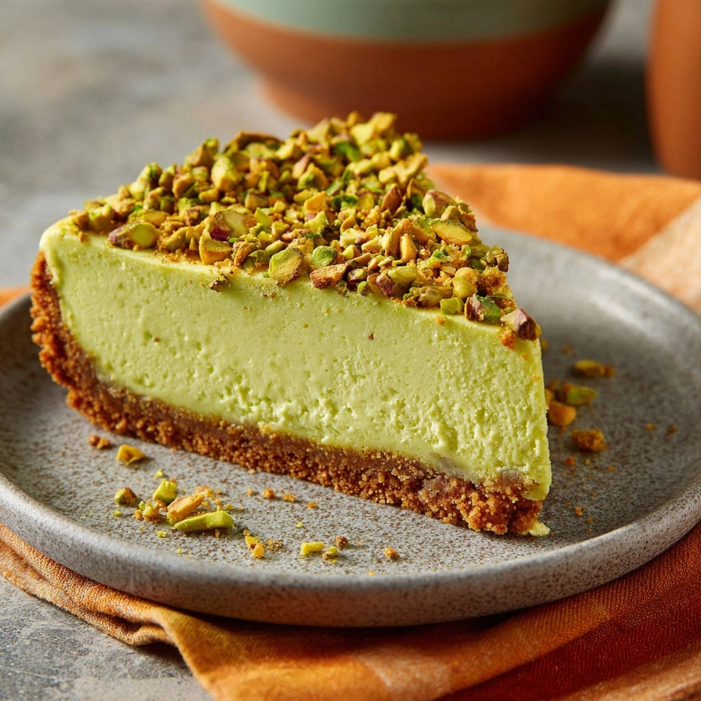 A delicate dusting of powdered sugar or a fine drizzle of white chocolate ganache can also elevate the presentation and flavor of your beautiful Pistachio Cheesecake.