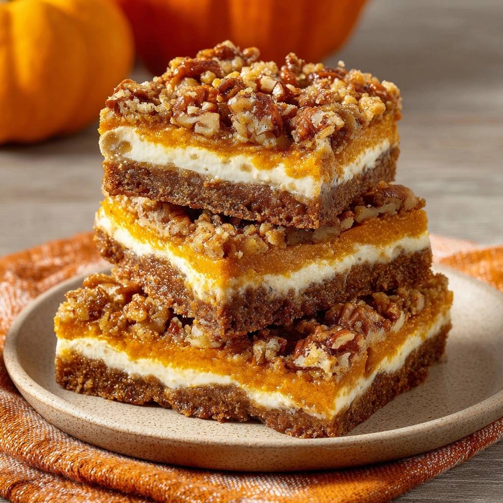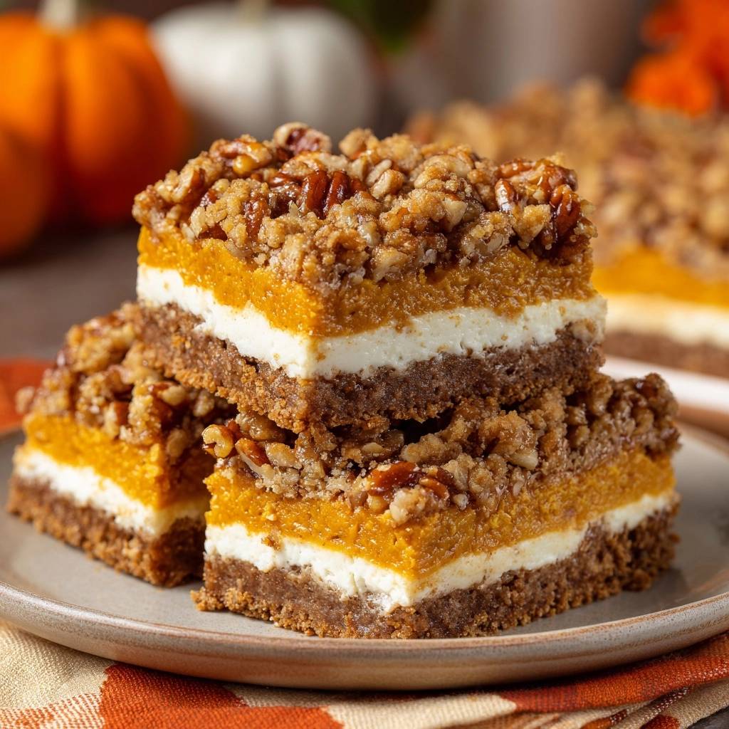 - Make the pecan topping: Mix pecans, brown sugar, melted butter, and flour until crumbly. Sprinkle evenly over the pumpkin layer. Bake 10 more minutes until topping is golden and crisp.