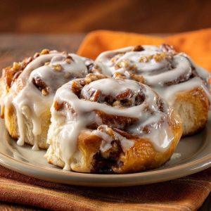 Fluffy homemade cinnamon rolls using tangzhong technique for pillowy texture, filled with pecans and topped with cream cheese icing.