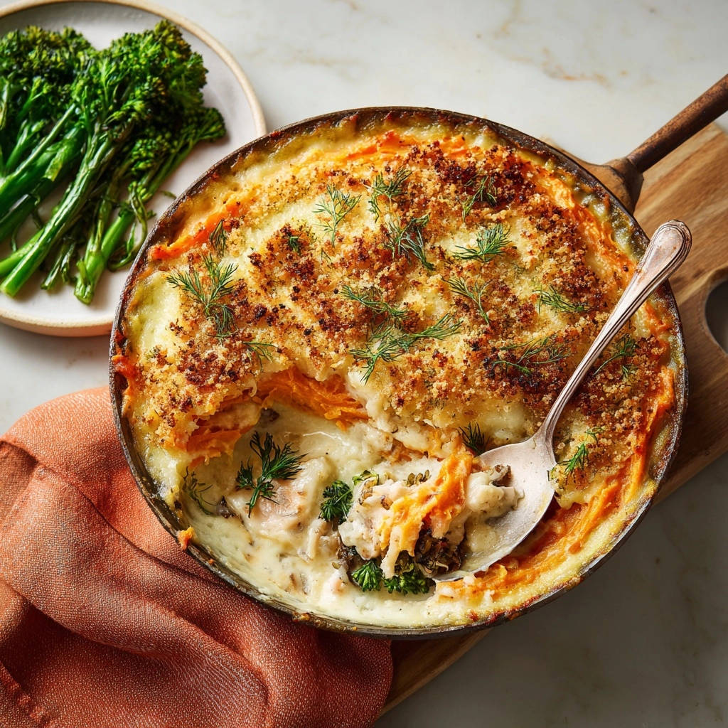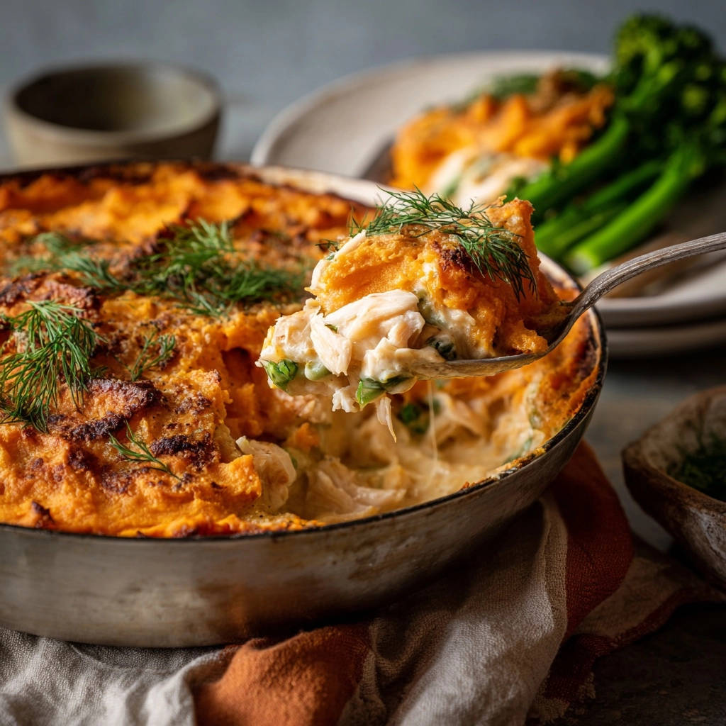 Remove the Savory Chicken and Sweet Potato Bake from the oven and let it rest undisturbed for 5 to 10 minutes. This mandatory rest allows the velvety filling to set completely. Garnish generously with fresh dill before serving.