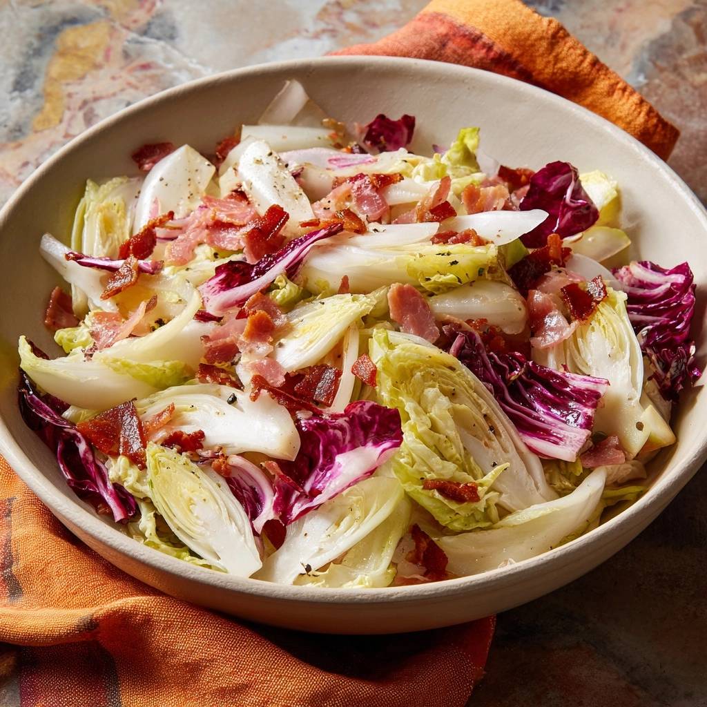 Thick-cut bacon gives smoky bite without grease overload; cook it crisp to drain fat well. Radicchio’s bitterness balances sweetness, while frisee’s curls trap dressing for texture. Curly endive swaps in perfectly if needed.