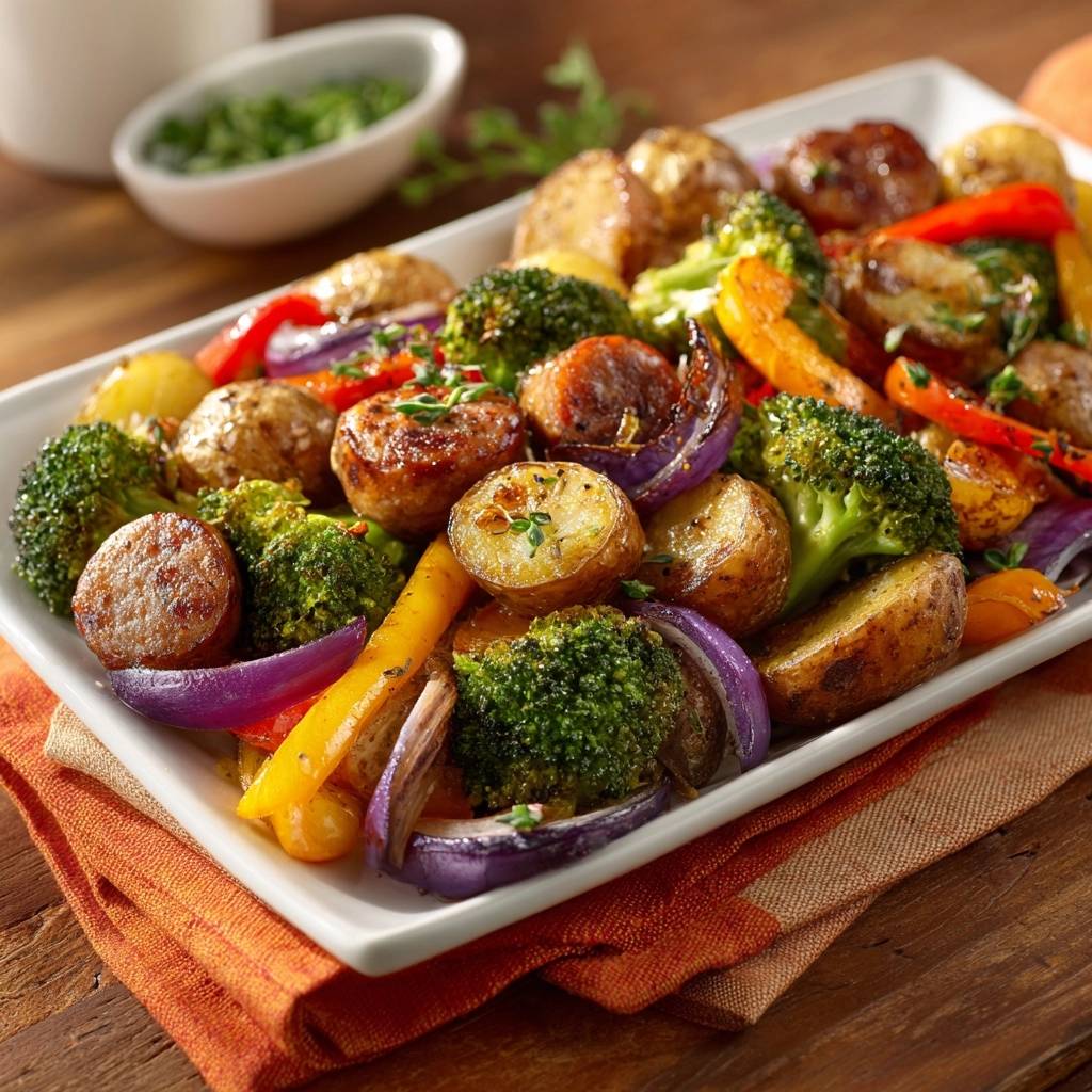 Start by roasting baby potatoes, bell peppers, onion wedges, and chicken sausage slices for 20 minutes. They build a crispy foundation through evaporation and the Maillard reaction, which browns surfaces beautifully. In addition, adding broccoli later keeps it crisp-tender with light char, never wilted.