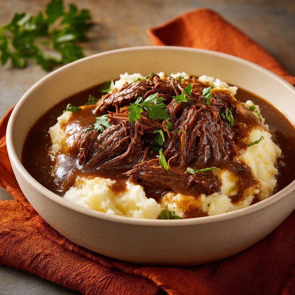 Shredded Beef Gravy over Creamy Mashed Potatoes