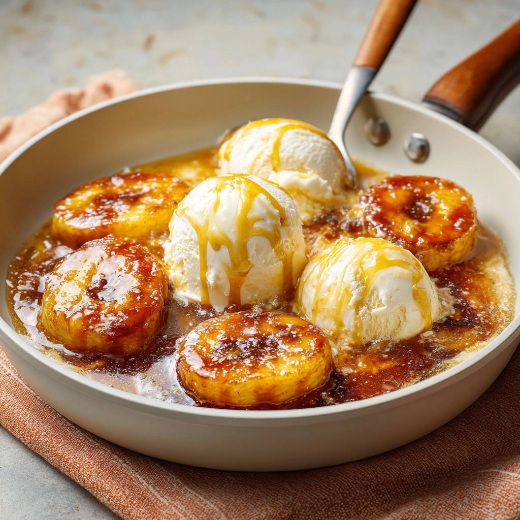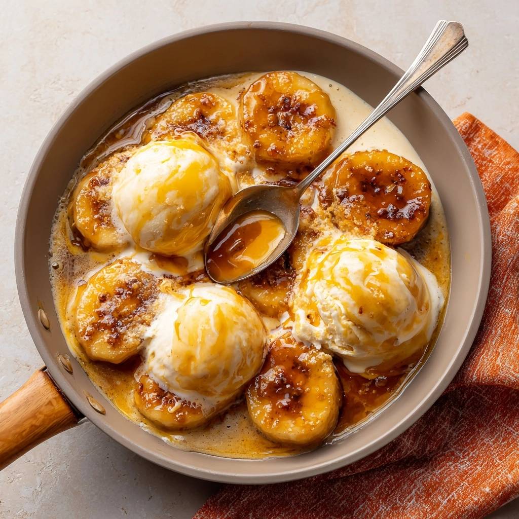 - Scoop vanilla ice cream directly into the warm skillet over bananas. Drizzle with warmed caramel sauce. Serve immediately straight from the pan with spoons for melty, shareable bliss. No mush, just perfection!