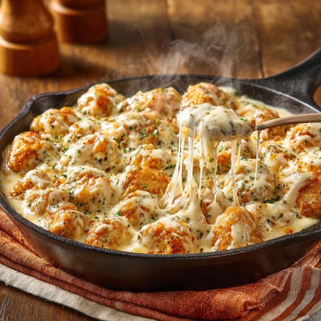Melt butter, stir in flour 1 minute for roux. Whisk milk till thick, add cheese low and slow. Pour over fried bites in the skillet, garnish parsley. Serve hot for cheese pulls.