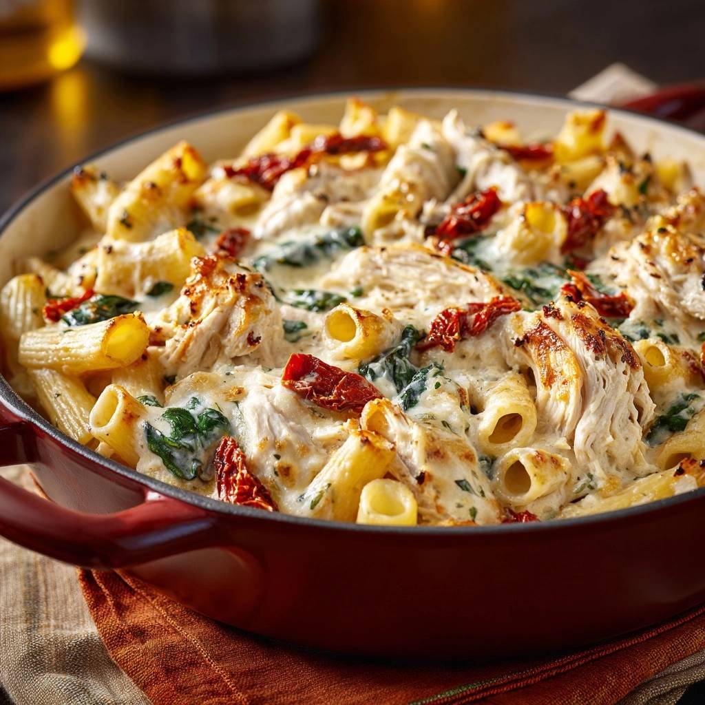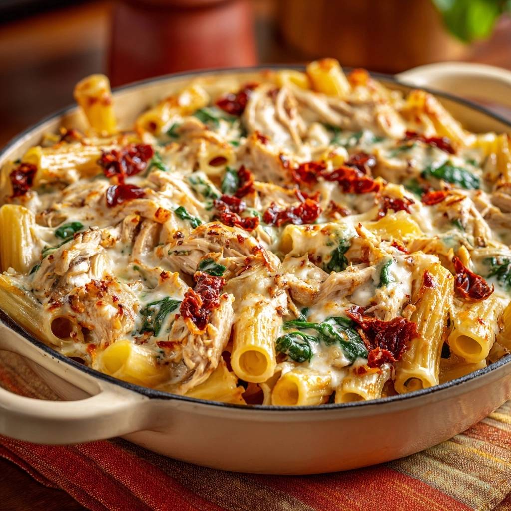 Therefore, you get tender rigatoni coated in rich cream, pops of tangy sun-dried tomatoes, and juicy shredded chicken all in one pan. No boiling over pots or extra dishes. It’s weeknight magic that beats takeout hands down.