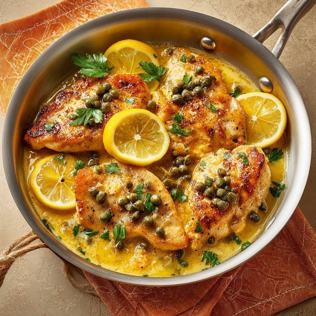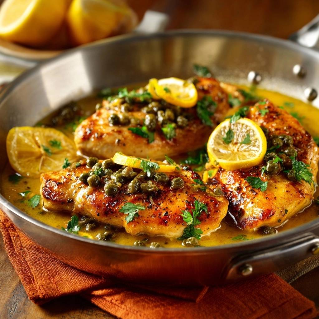 1 cup chicken broth deglazes like magic, 1/4 cup fresh lemon juice from 2 lemons brings punch, and 1/2 cup drained capers deliver briny pop. Finish with 1/4 cup chopped fresh parsley and lemon slices for garnish.