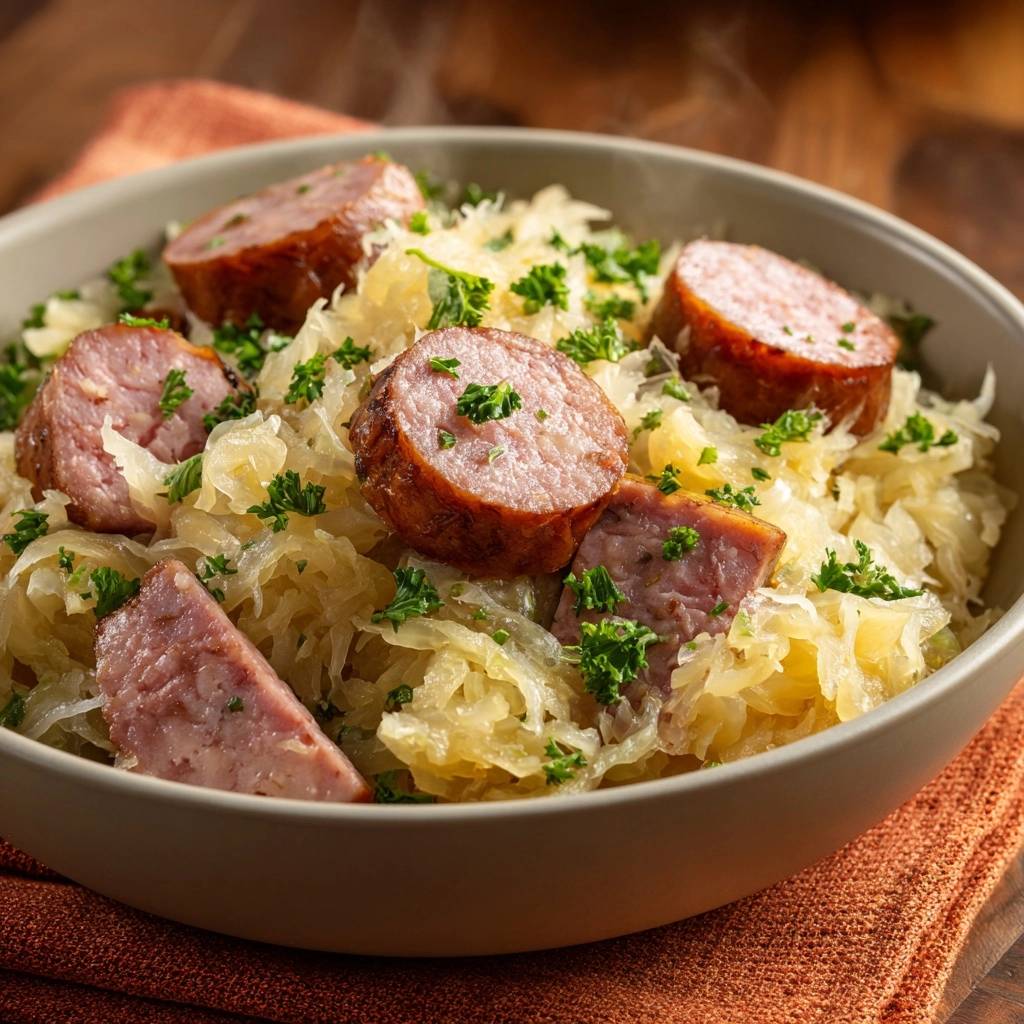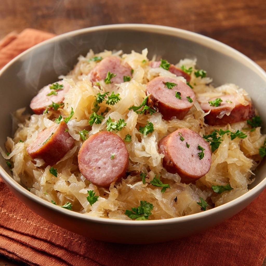 Keep in an airtight container in the fridge for up to 4 days. Reheat gently on stovetop to restore sausage crisp and sauerkraut snap; avoid microwave for best results.