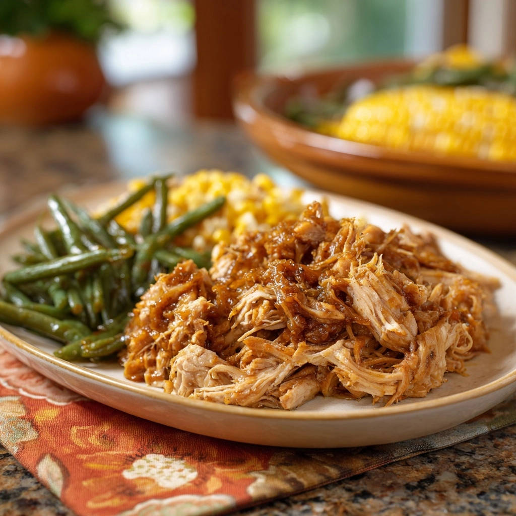 Time to Enjoy: Serve the hot, incredibly moist, and tender Slow Cooker BBQ Pulled Chicken alongside your freshly prepared green beans and corn. Pile that saucy chicken high on buns, serve it over rice, or enjoy it straight from the bowl. Get ready for rave reviews!