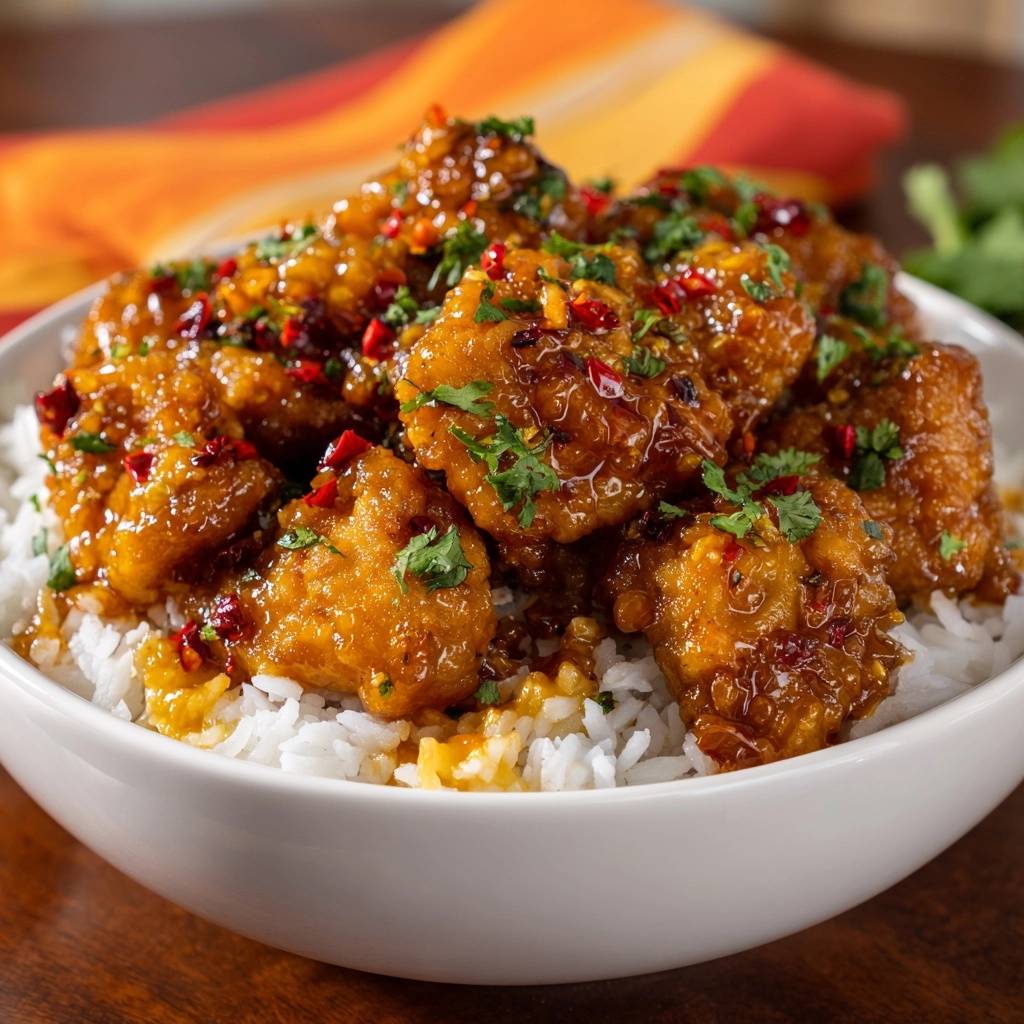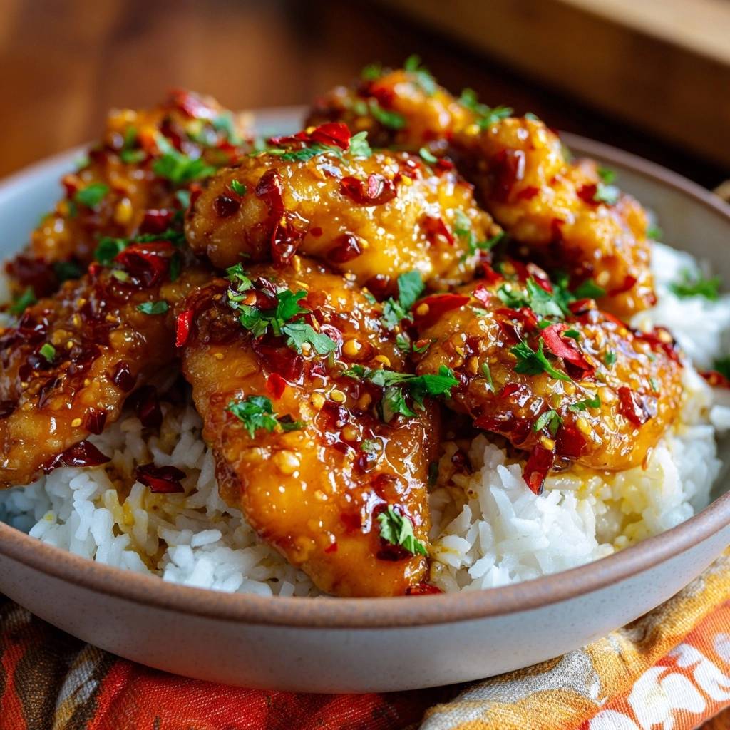 You’ll need 1.5 lbs boneless chicken thighs cut into bite-sized pieces, 1 cup cornstarch, 1/2 cup all-purpose flour, 2 beaten eggs, vegetable oil for frying, 2 cups cooked white rice, 1/2 cup soy sauce, 1/4 cup honey, 1/4 cup orange juice, 1/4 cup rice vinegar, 6-8 dried red chilies, 4 minced garlic cloves, 1 tablespoon grated ginger, 1/2 cup chopped cilantro, and 2 sliced green onions. Each plays a key role in crunch and sticky chili magic.
