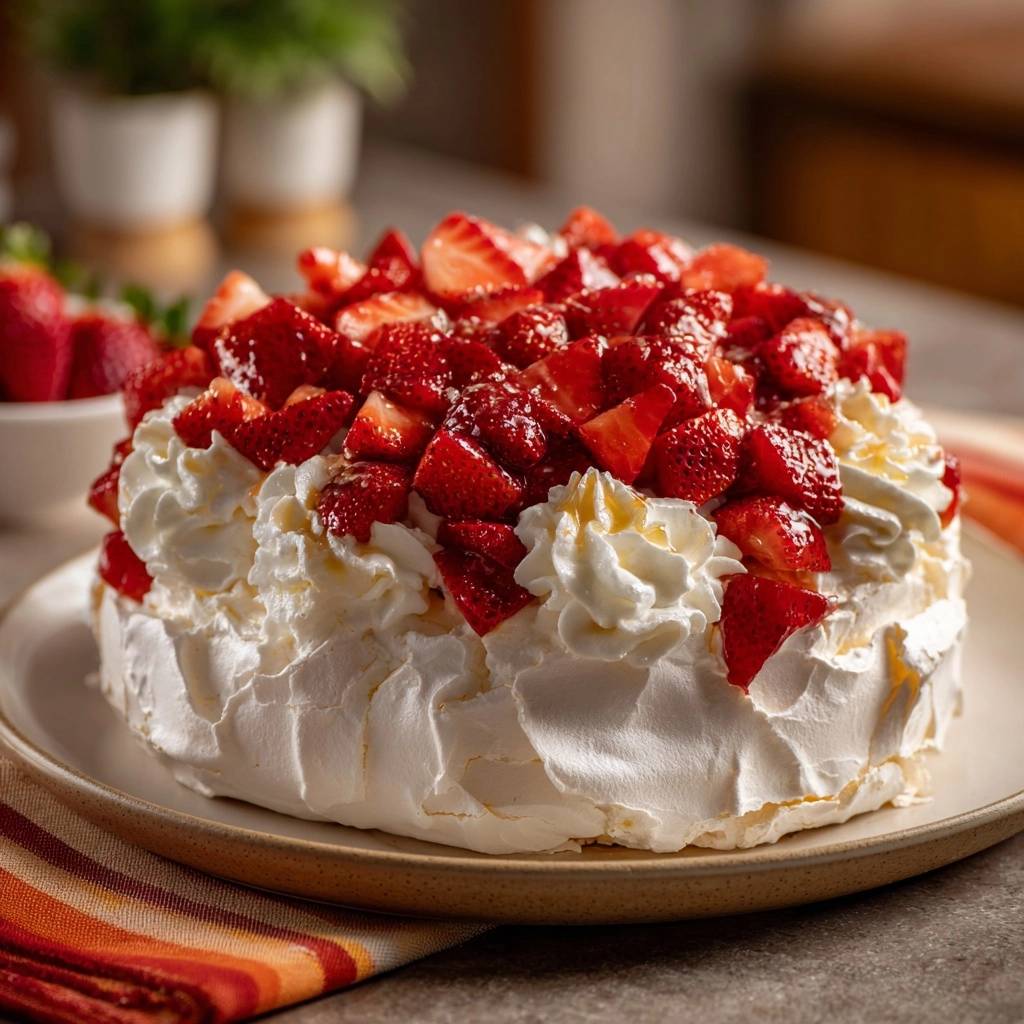 - Whip cream with powdered sugar to stiff peaks. Pile onto cooled pavlova base. Top generously with sliced strawberries. Serve immediately for ultimate stability. Store leftovers uncovered in fridge up to 1 day.