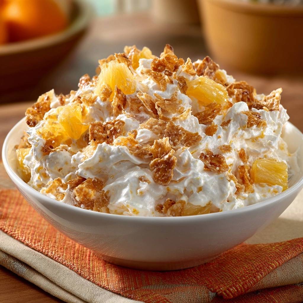 A creamy pineapple fluff salad featuring a secret stovetop caramelization technique that keeps the cereal topping perfectly crunchy and moisture resistant.