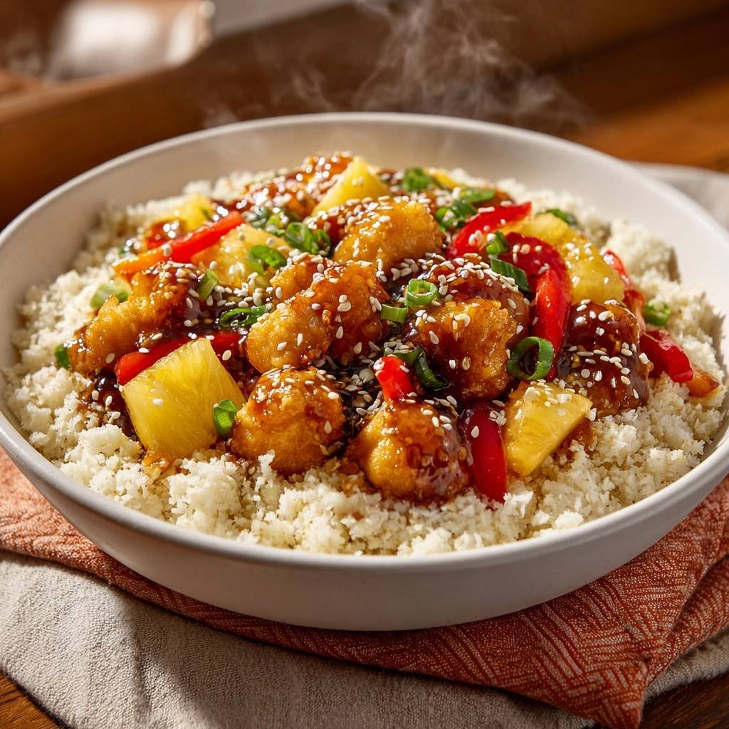 Ultra-crispy fried chicken tossed in glossy pineapple sauce that stays crunchy thanks to double-fry technique. Low-carb with cauliflower rice.