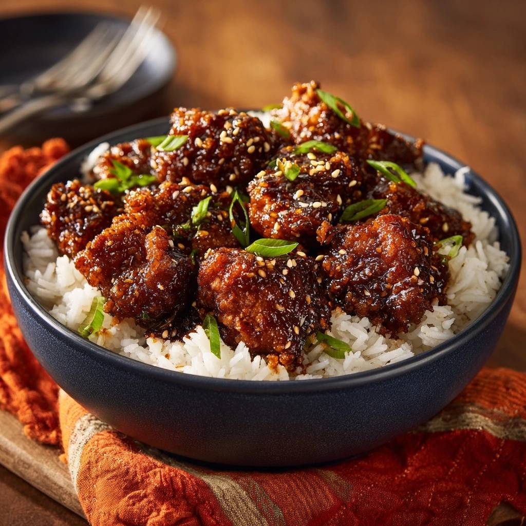 Crispy sesame chicken bowls with juicy chicken, double-fried for ultimate crunch that stays crisp under sticky sauce, served over rice.