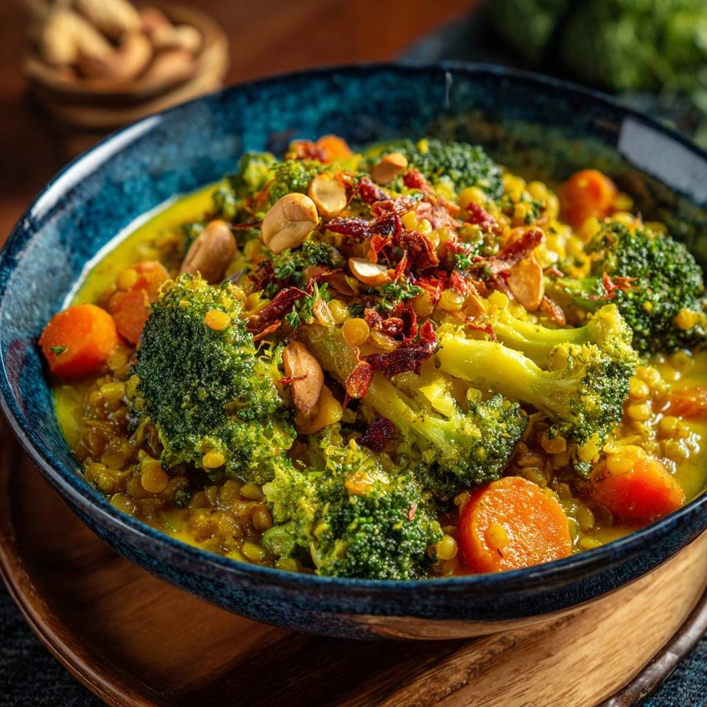 Creamy lentil curry with crisp-tender broccoli and carrots using a staggered cooking method to prevent mushy veggies. Topped with peanuts and chili flakes for crunch and heat.