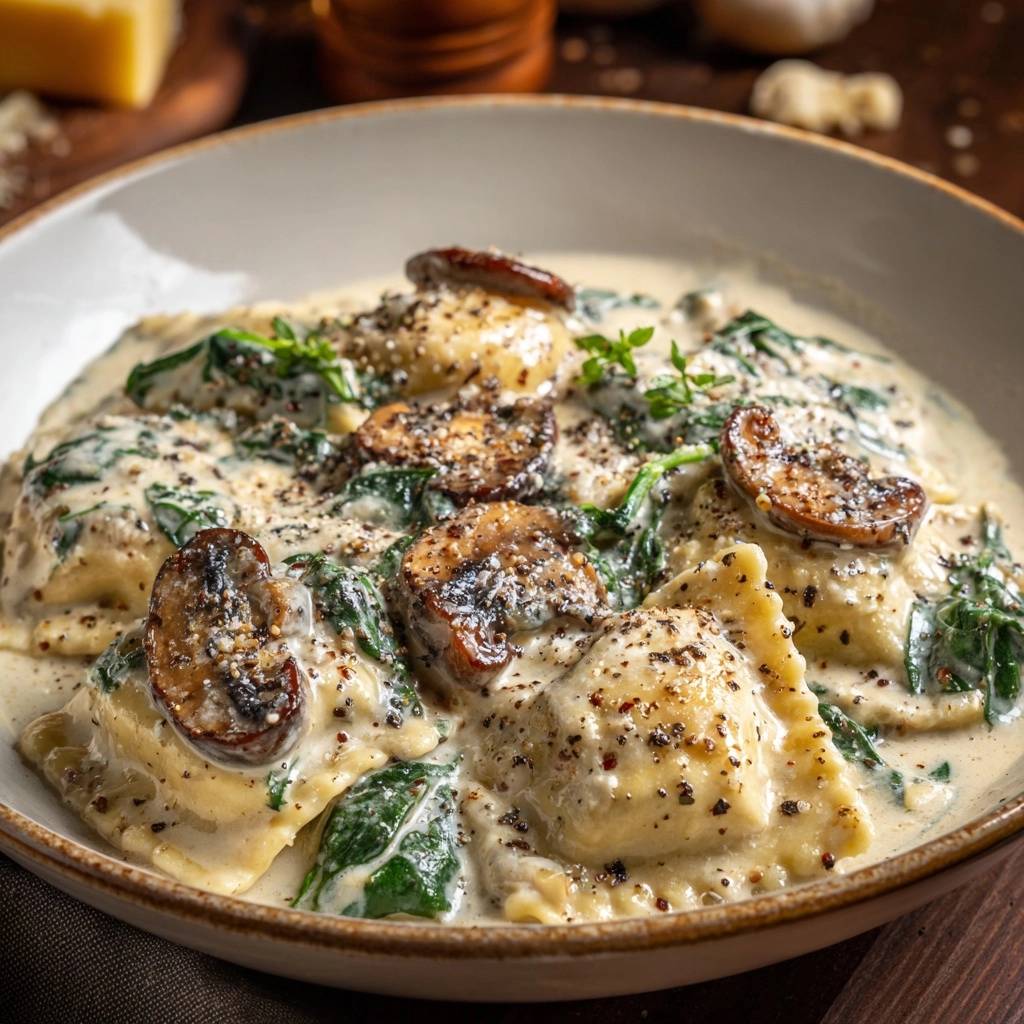 Creamy mushroom spinach ravioli with a foolproof sauce that stays silky, never watery. Perfect browned mushrooms, wilted spinach, and plump ravioli for a restaurant-worthy pasta dish at home.