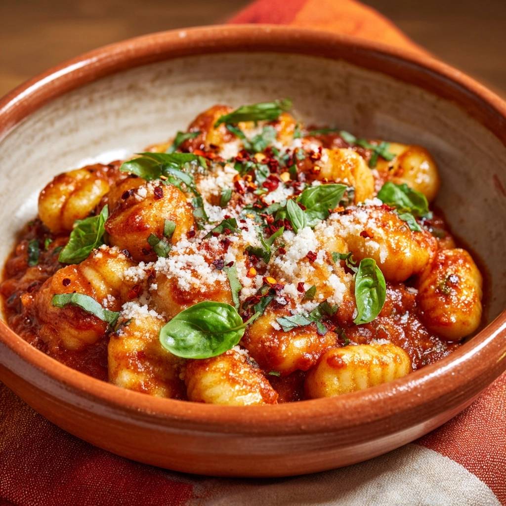 Crispy-edged gnocchi in spicy tomato sauce. Boil just until they float, then pan-sear for perfect tender texture without gumminess.