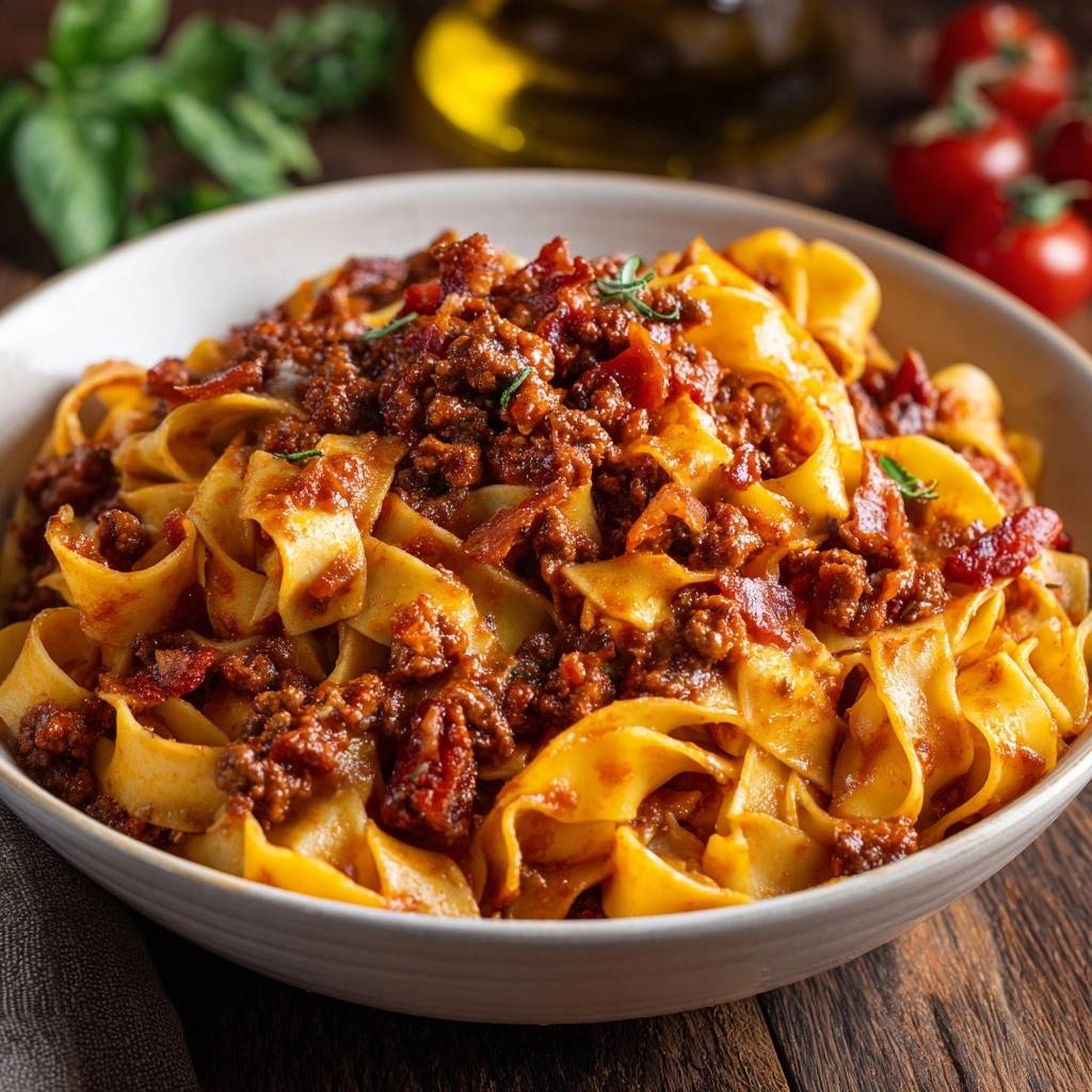 Foolproof Pappardelle with thick, restaurant-style beef ragu that coats every noodle without turning watery. Brown meat first to evaporate moisture, then simmer low and slow for perfect thickness.