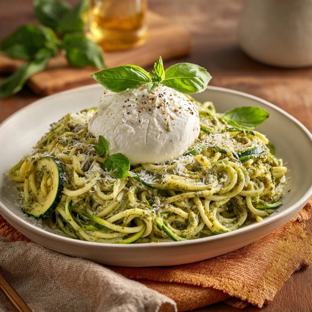 Healthy zucchini noodles with vibrant pesto and creamy burrata. A simple salting trick ensures firm, al dente zoodles that never get soggy.