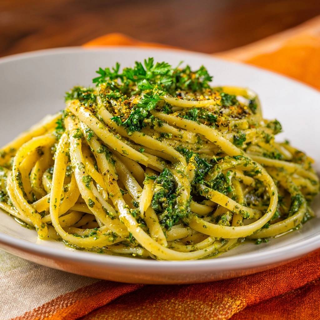 Creamy parsley pesto pasta that clings to every noodle using a simple pasta water emulsion technique for perfect sauce coverage.