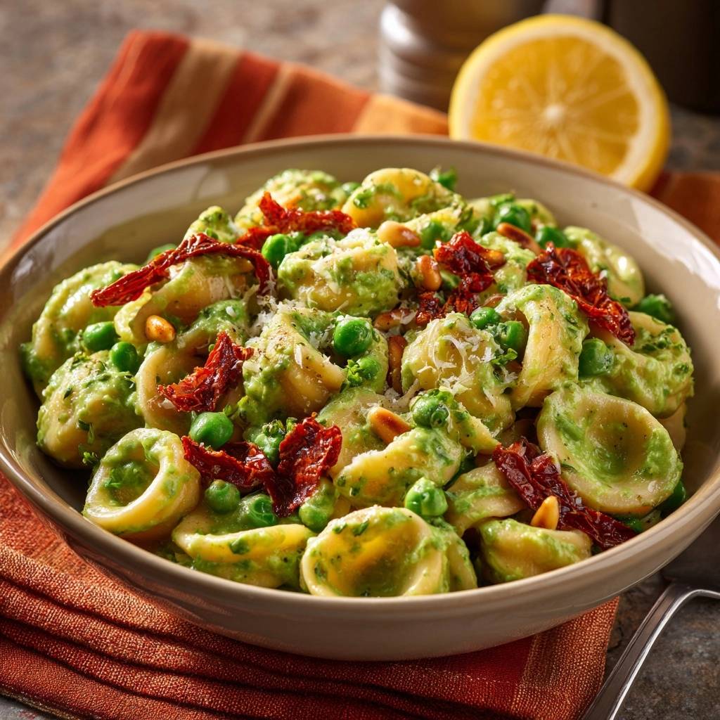 Silky smooth pea pesto coats orecchiette pasta with sun-dried tomatoes and pine nuts for a vibrant, grit-free Italian dish.