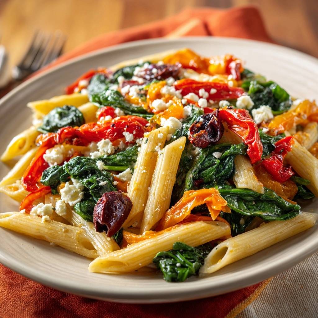 Vibrant penne pasta with perfectly wilted spinach, roasted peppers, sun-dried tomatoes, and feta—no soggy greens!