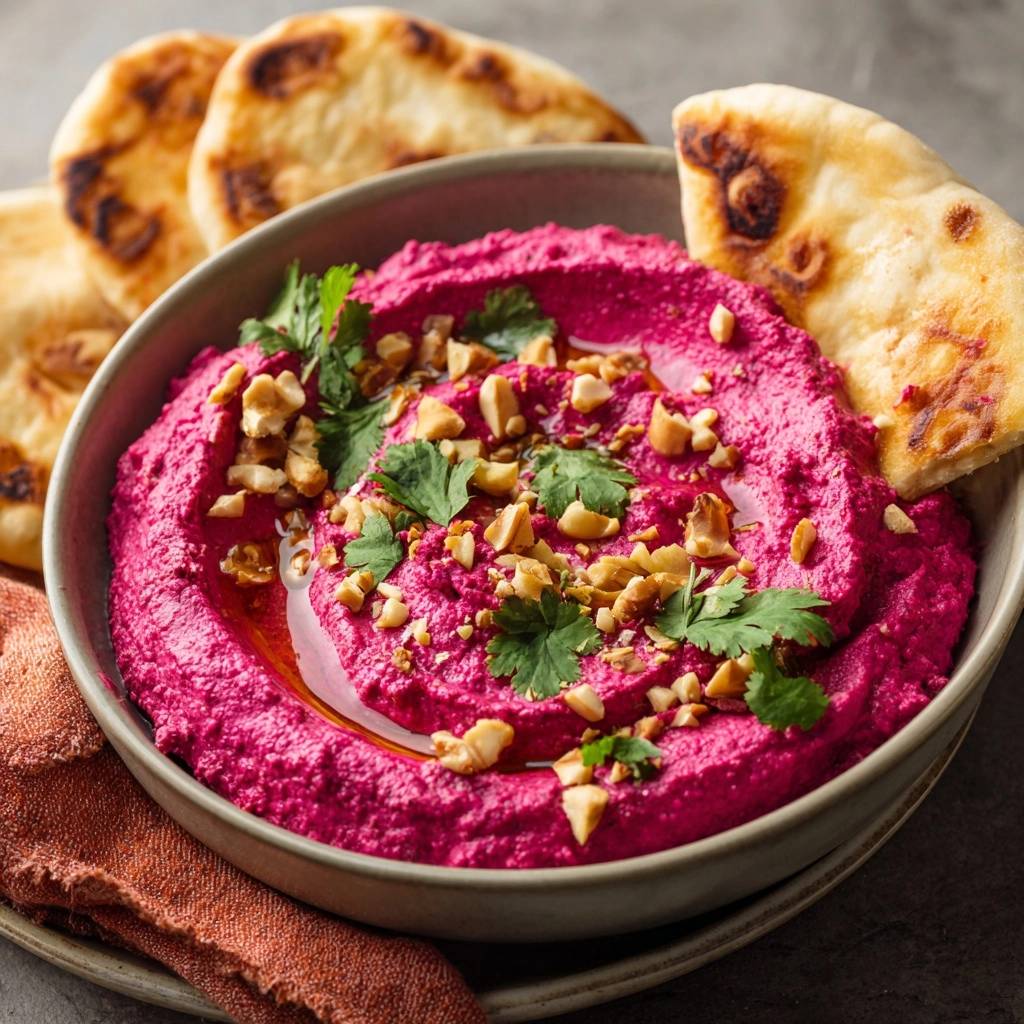 Creamy beet hummus made silky smooth with ice cubes, topped with walnuts. Perfect dip for charred naan—no more grainy texture!