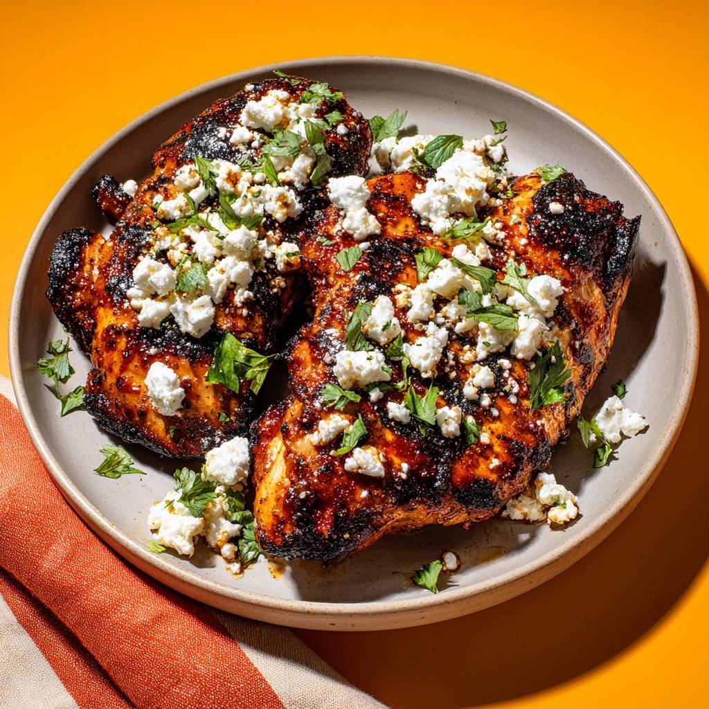 Juicy, charred chicken thighs marinated in yogurt and harissa, topped with feta and fresh herbs for a flavorful grilled main dish.