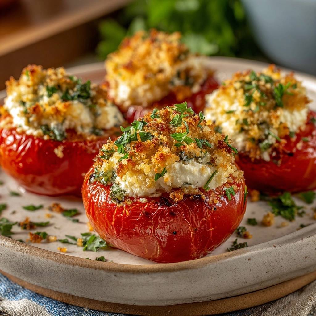 Crispy herbed feta stuffed tomatoes with a simple drain-and-oil trick to prevent soggy breadcrumbs. Perfectly golden and crunchy every time!