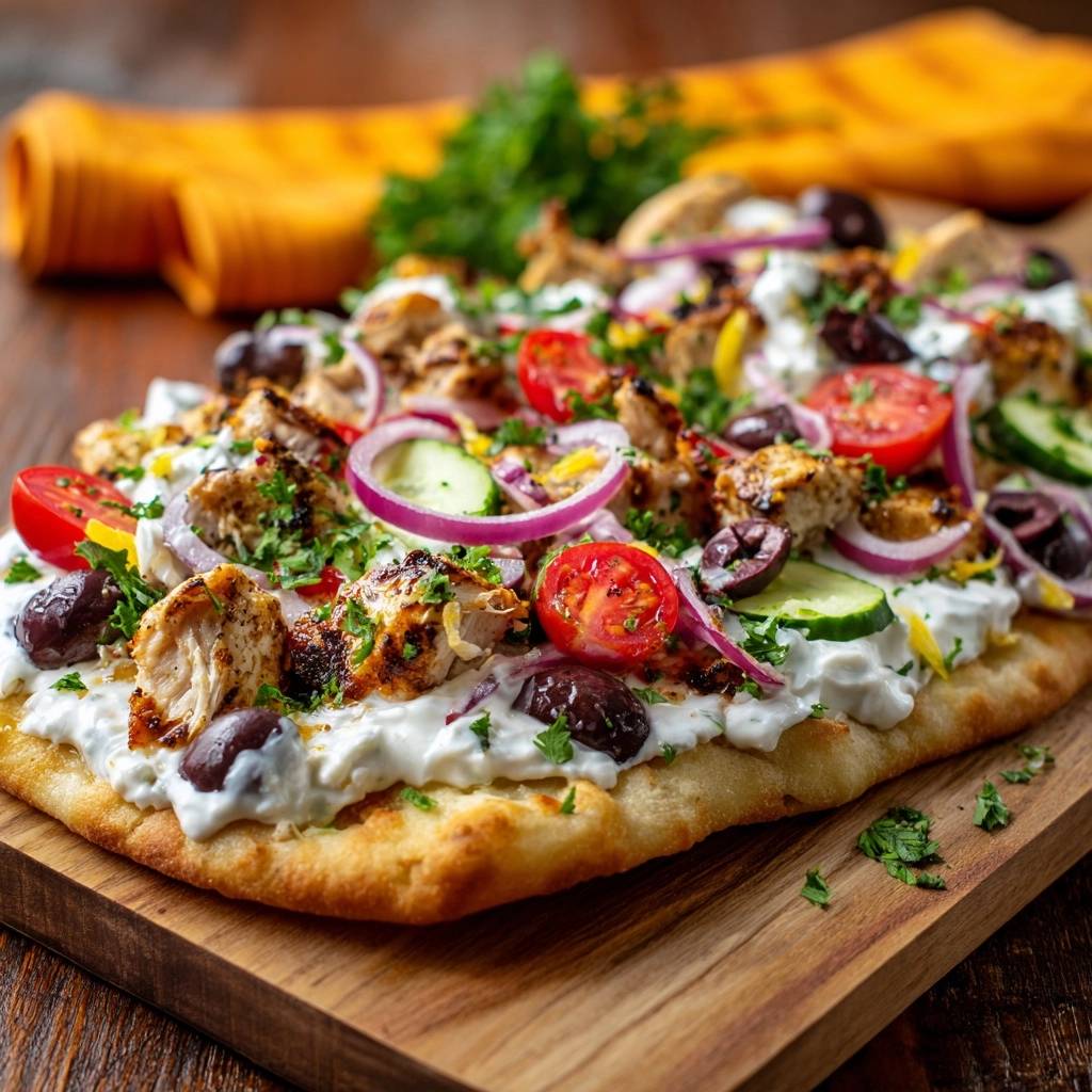 Crispy Greek chicken flatbread with marinated chicken, Greek yogurt, fresh veggies, and olives. High-heat pre-bake seals the dough for no-soggy perfection.