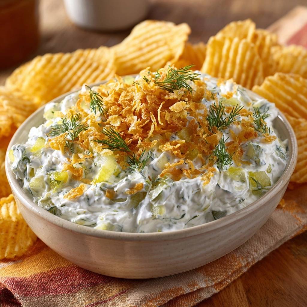 - Just before serving, top the center of the dip with a generous mound of crispy fried onions. Sprinkle the reserved diced pickles and fresh dill sprigs over the top to match the vibrant, layered look of the image.