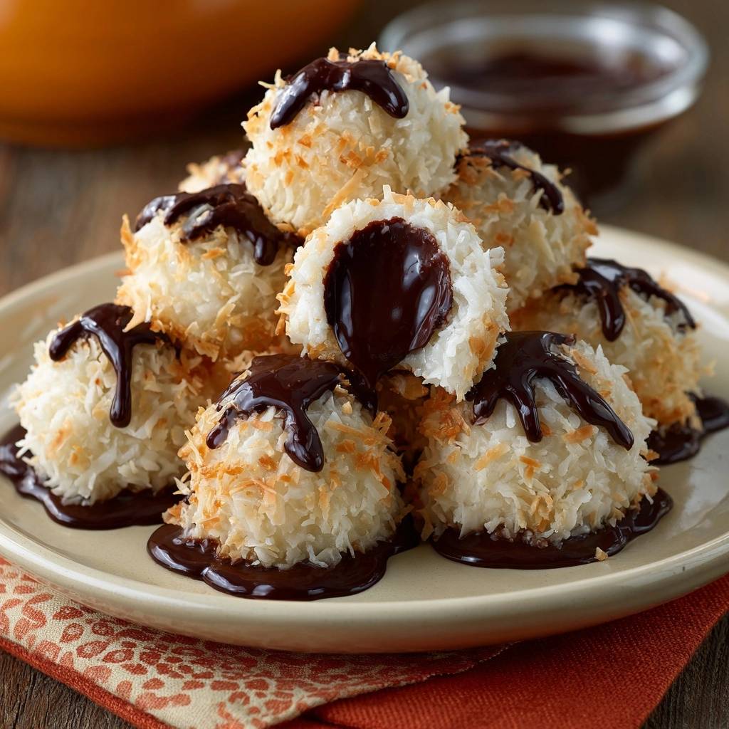 - Assemble: Scoop 2 tbsp batter, flatten into disc. Press 1 frozen chocolate ball into center. Mold dough around it completely, sealing edges tight. Roll in toasted coconut to coat. Place on baking sheet. Repeat.