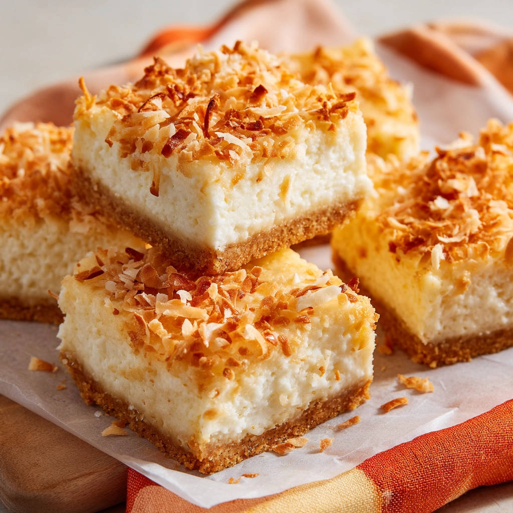 - Top with Toasted Coconut: Sprinkle the toasted coconut evenly over the top of the filling. The toasted coconut adds a nutty flavor and a beautiful golden-brown color to the finished bars.