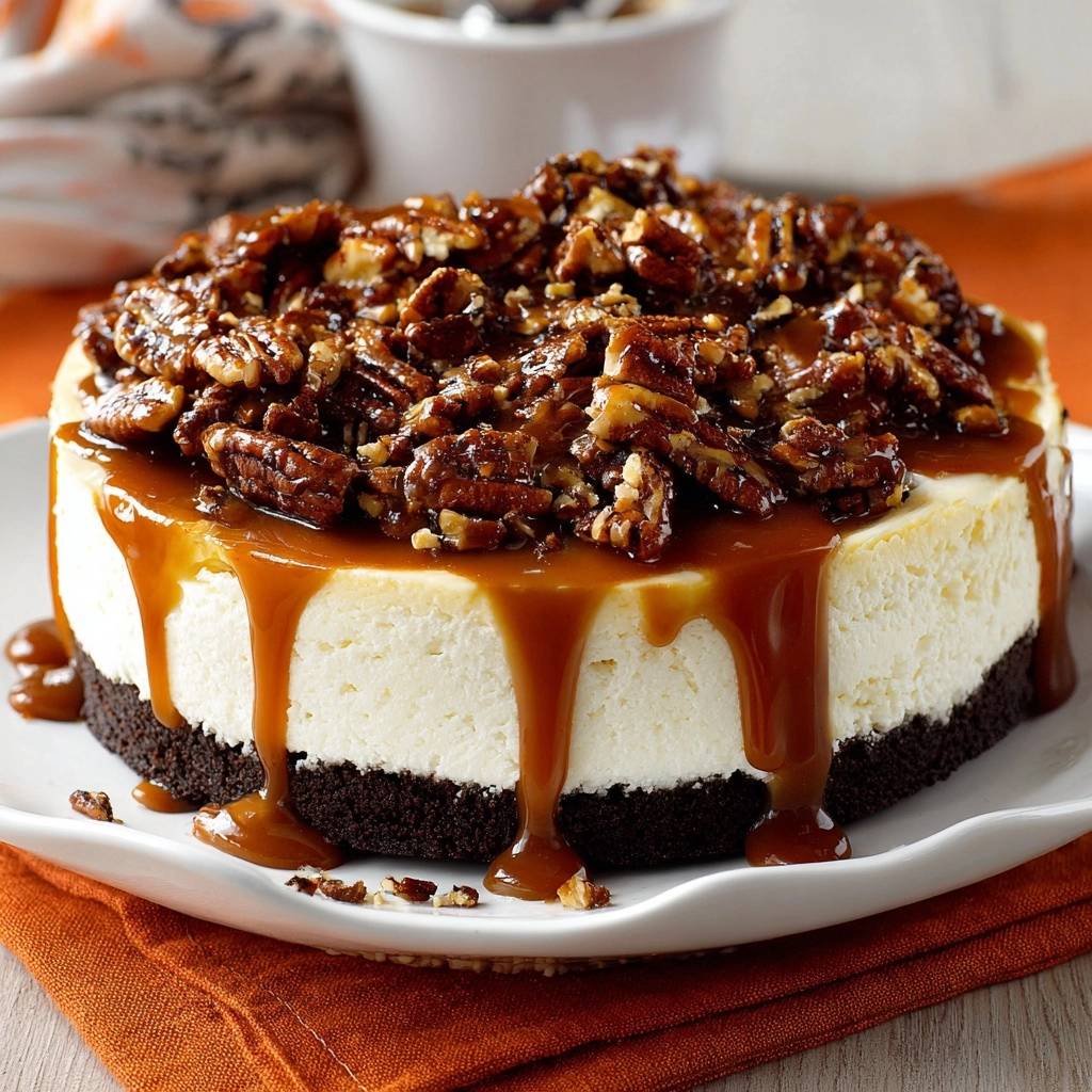 - For ganache: Heat heavy cream until simmering, pour over chocolate chips in a bowl, let sit 2 minutes, then stir until smooth and glossy. Pour ganache over chilled cheesecake, spreading to edges and letting it drip down sides. Arrange toasted pecans on top of ganache. Drizzle with warm caramel sauce. Chill 30 minutes to set, then slice and serve.