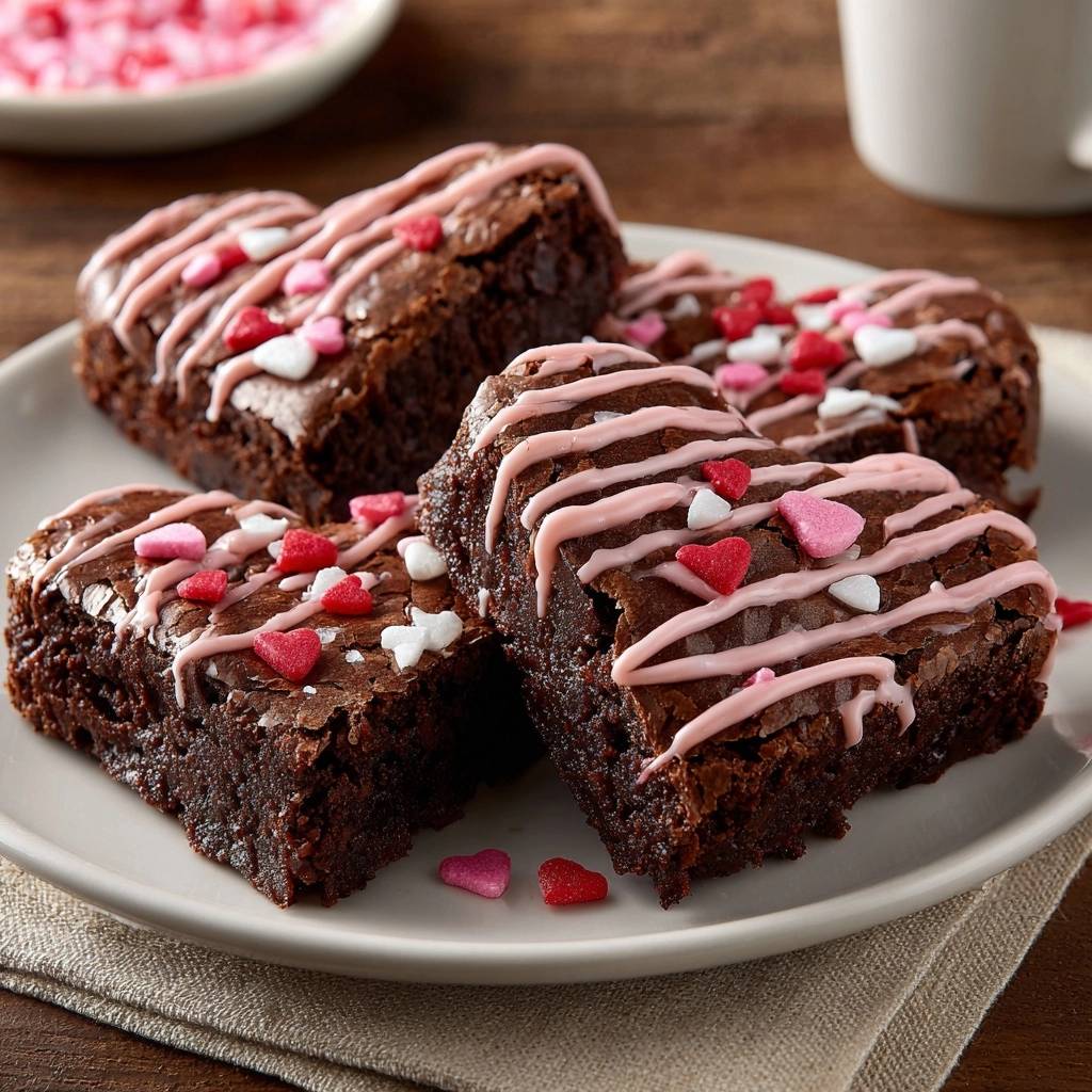 - Immediately add pink/red sprinkles and heart candies before drizzles set. Serve or store chilled. Fudgy perfection!