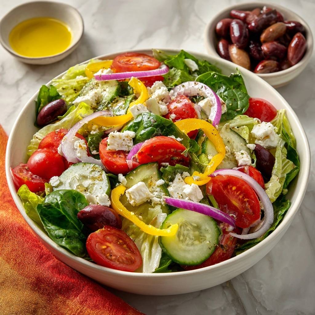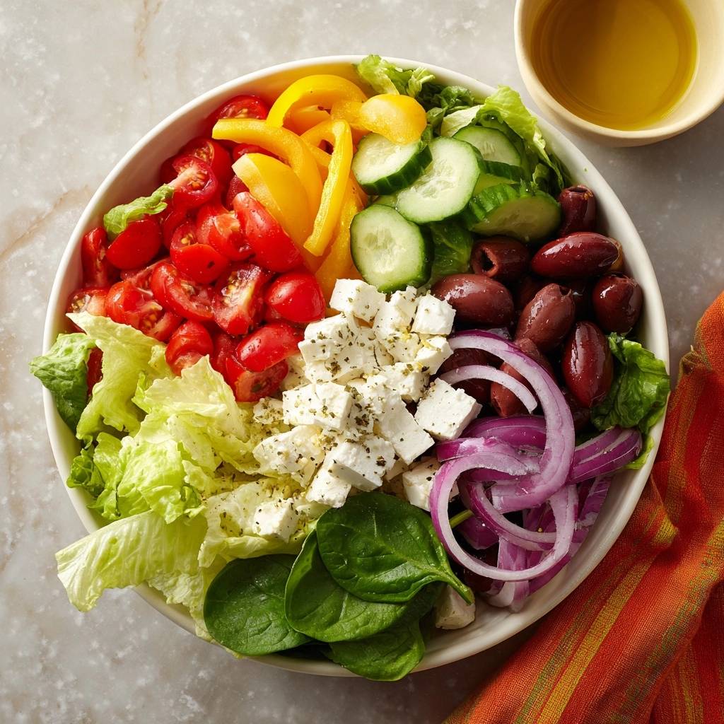 Extra virgin olive oil shines here; its fruity bite coats without overpowering. Kalamata olives bring briny punch, pitted for easy eating. Romaine and spinach form a sturdy base that holds up.